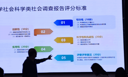 在 “项目升级” 环节,刘兵副教授聚焦赛事评审要点,以 “高教主赛道创意组评分标准” 为例,从个人成长、项目创新、产业价值、团队协作四大维度展开解读:首先在个人成长方面,项目需体现 “立德树人” 成效,扎根中国大地调研国情民情,展现学生运用专业知识解决实际问题的能力,以及院校在 “新工科、新医科、新农科、新文科” 建设中的育人成果;其次,项目创新上,要遵循 “从创意到实践、从基础研发到应用研发” 的逻辑,基于学科专业知识,从产品、工艺流程、服务模式或商业模式等方面实现突破,用 “创新成效” 证明团队实力;紧接着在产业价值上需清晰呈现 “产业认知、市场定位、落地前景、社会影响”,让项目既具商业潜力,又能服务社会发展;最后在团队协作方面,团队要展现 “明确的使命愿景、合理的组织架构、高效的协作机制”,同时注重整合内外部资源,为项目成长赋能。