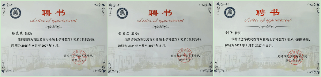 (美术学院 通讯员 袁美)近日,黄冈师范学院美术学院公布硕士研究生指导教师名单。我院杨豪良、管启文、刘浩三位教授获聘该校教育专业硕士学科教学(美术)兼职硕士研究生指导教师。