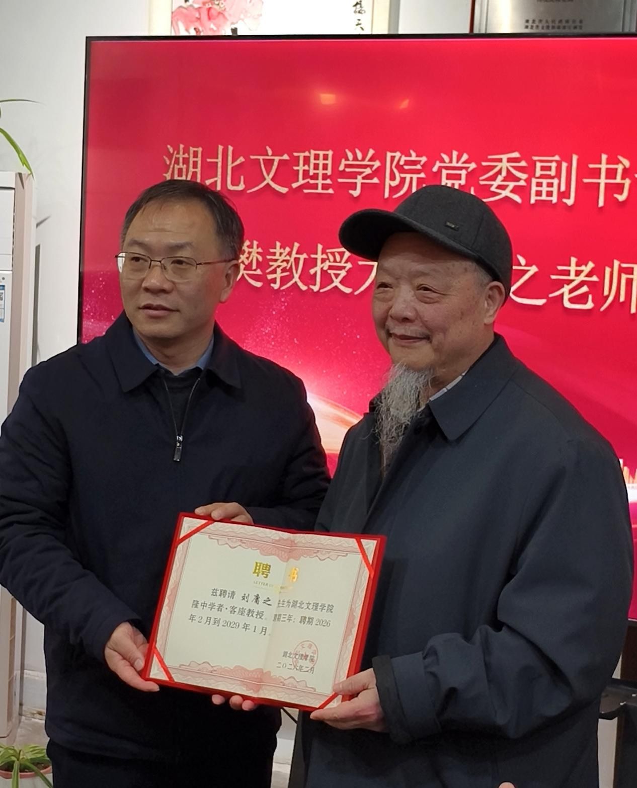 张樊代表学校向刘庸之先生颁发了聘书,并对其加盟美术学院表示热烈欢迎。他在讲话中指出,刘庸之先生是襄阳文化的杰出代表,是中华优秀传统文化的坚定守护者和卓越践行者。他强调,美术学院正处在深化内涵建设、提升办学质量的关键时期,聘请刘庸之先生为客座教授,是我校实施“人才强校”战略、主动融入地方文化生态的重要举措。他要求美术学院,完善机制,全力做好保障,为刘庸之先生创造良好工作条件;主动对接,虚心深入学习,传承刘庸之先生的精湛技艺、艺术经验和崇高艺德;统筹规划,务求合作实效,制定具体可行的合作计划,在学科发展、课程建设和艺术创作实践等方面充分发挥客座教授的作用。